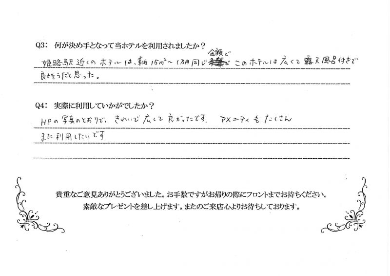 お客様の声-素敵なひと時をお過ごし頂ける、姫路のラブホテル・レジャーホテルです